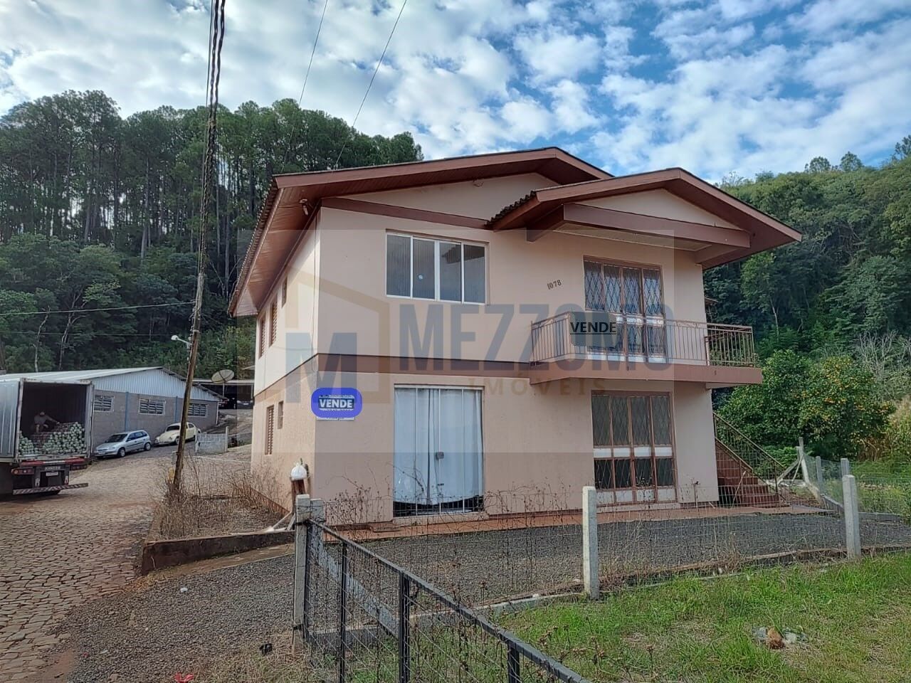 Casa com dois pavimentos, parte de cima com 3 quartos e demais cômodos, parte inferior pode ter utilização comercial ou residencial. Terreno encravado, com servidão de passagem averbada e lote parcialmente cercado definido.
